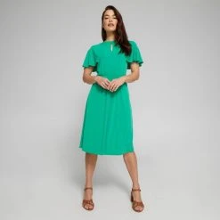 Designed exclusively for Harris Scarfe by Australian designer Jane Lamerton, the Fit and Flare Jersey Dress is a gorgeous addition to your dress collection. This dress can take you from desk to dinner. Made in soft, stretch jersey this dress features round neck band with button opening and full flutter sleeves. The waist is defined with a self fabric band and has a soft skirt with gathers.