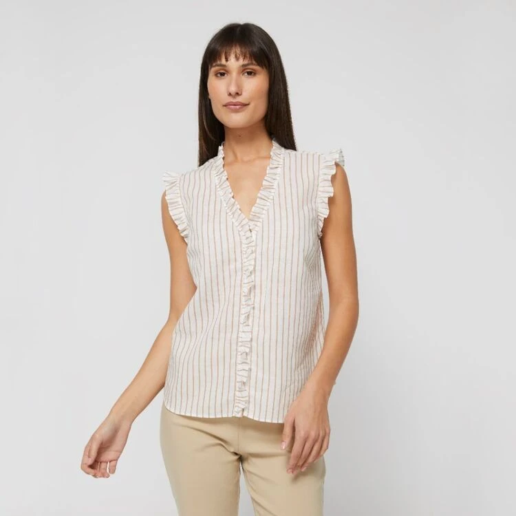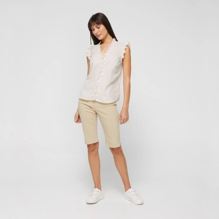 Opt for comfort and style courtesy of the stripe frill shirt by Australian designer Jane Lamerton. Step out confidently with this breathable shirt made from natural cooling fibres like ramie and cotton. Featuring a feminine frill sleeve, placket details and neutral stripe prints – this is a summer outfit you won’t go wrong with. Shop your size only at Harris Scarfe today.