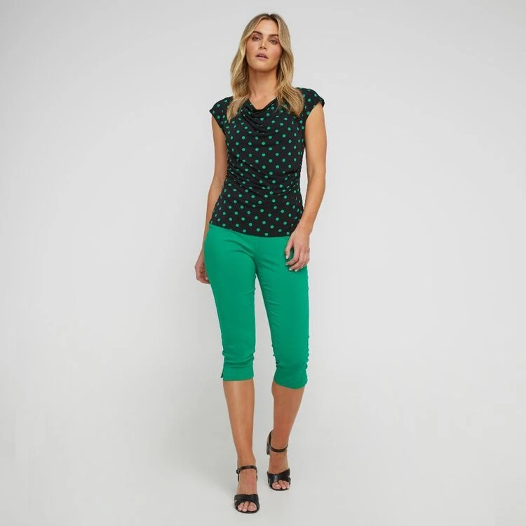 Designed exclusively for Harris Scarfe by Australian Designer Jane Lamerton, the Goddess Top will take you from desk to dinner and is perfect to pair with a jacket or cardi. Constructed from soft, stretch jersey and featuring a soft cowl neckline, this top has a little cap sleeve and is complete with a timeless polka dot print in green and black.