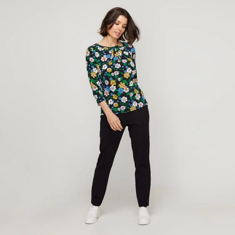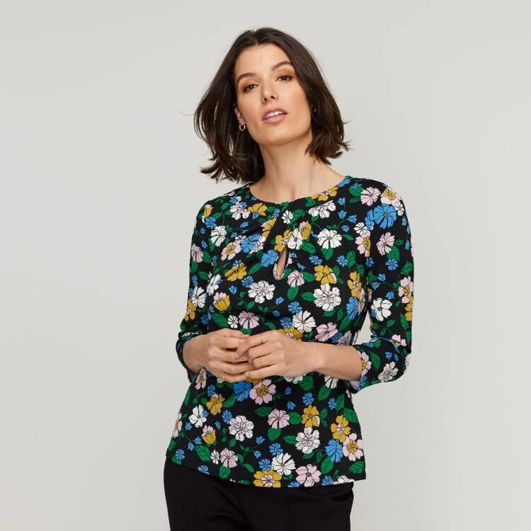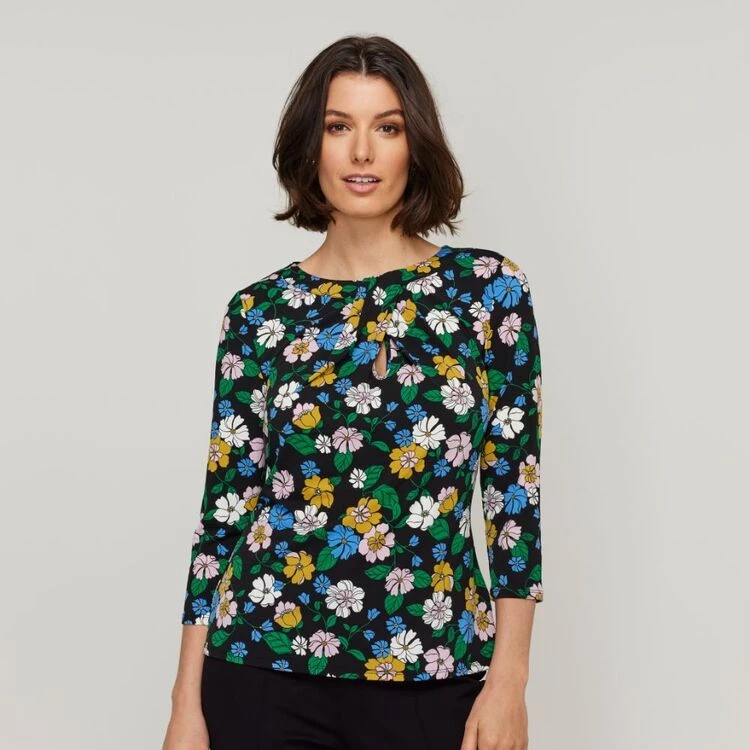 Look stylish and feel comfortable in this exclusive Retro Floral Jersey Twist Neck Top designed by Jane Lamerton for Harris Scarfe. This beautiful top has twist neck and keyhole front details, perfect for pairing with your favorite pants, skirts, jackets or cardigans. Crafted from a soft stretch jersey fabric, you’ll stay comfortable while looking your best.