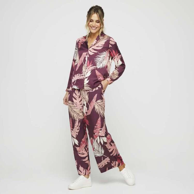 Designed exclusively for Harris Scarfe by Jayson Brunsdon, this shirt in a panama palm print conjures up holidays on a Caribbean cruise. Featuring a full length sleeve, deep cuffs, a V neckline and low collar and rever, the shirt is designed to be worn as a glamorous pyjama set in satin with the matching printed pant in panama palm print.