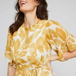 Designed exclusively for Harris Scarfe by Jayson Brunsdon, this gorgeous V Neck Ruffle Dress has a fluid femininity printed in the panama palm in a textured fabric. Featuring an appealing v neck highlighted with a cascading ruffle, fitted waist and flowing skirt from the hips, this dress takes you from lunch to dinner with an easy glamour.