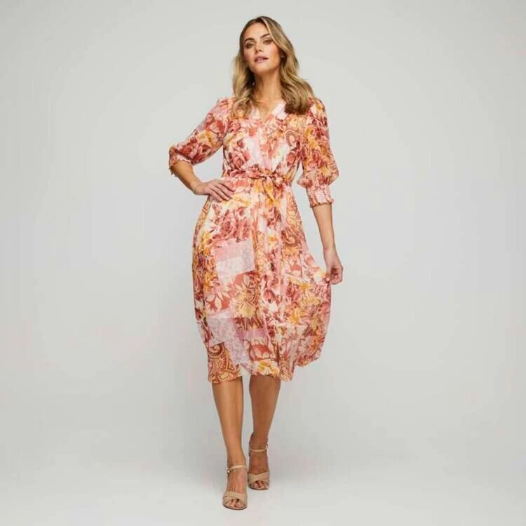 Designed exclusively for Harris Scarfe by Jayson Brunsdon, the Wrap Front Midi Dress in spicy tones is as chic as a Caribbean cocktail. Featuring a mock wrap front, self fabric tie and full sleeves with shirred cuffs, this collage print dress, paired with sexy strappy heels, takes you anywhere with the ease of a summer breeze.