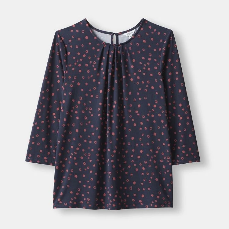 The Khoko Smart 3/4 Sleeve Pleat Top is made from a comfortable soft jersey fabric in a classic spot print with elegant pleat front detail and keyhole back neck. This wardrobe essential is the perfect piece for layering under cardigans and jackets and pairing it back with denim jeans, ponte pants and skirts.