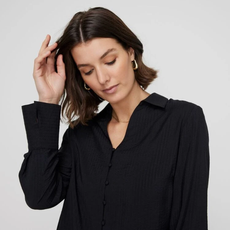 Introducing the Khoko Smart Split Cuff Shirt. A stylish, detail-oriented shirt designed for both business and casual wear. It is crafted in a luxe viscose nylon texture stripe fabric, featuring self-covered buttons and a unique split cuff that is sure to draw attention. Perfect for those long office hours or special occasions – this versatile top will become a favorite piece in your wardrobe!