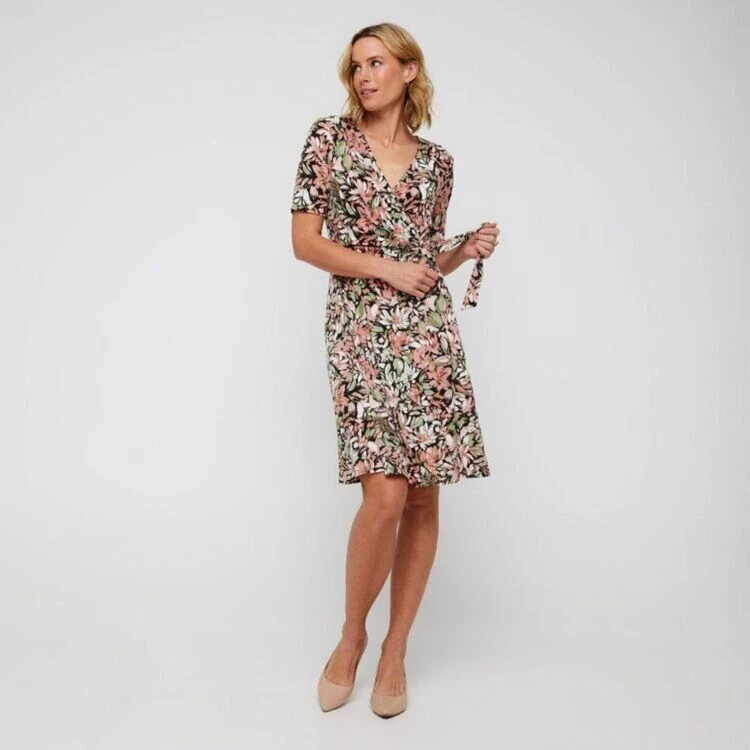 This feminine Khoko Smart Wrap Front Jersey Dress is an easy wear piece made in soft jersey that drapes beautifully. It features a mock wrap with self fabric tie and a small collar. This dress has short sleeves and a calf skimming skirt. Available in our impressionist magnolia print. Shop the Khoko Smart range exclusively at Harris Scarfe!