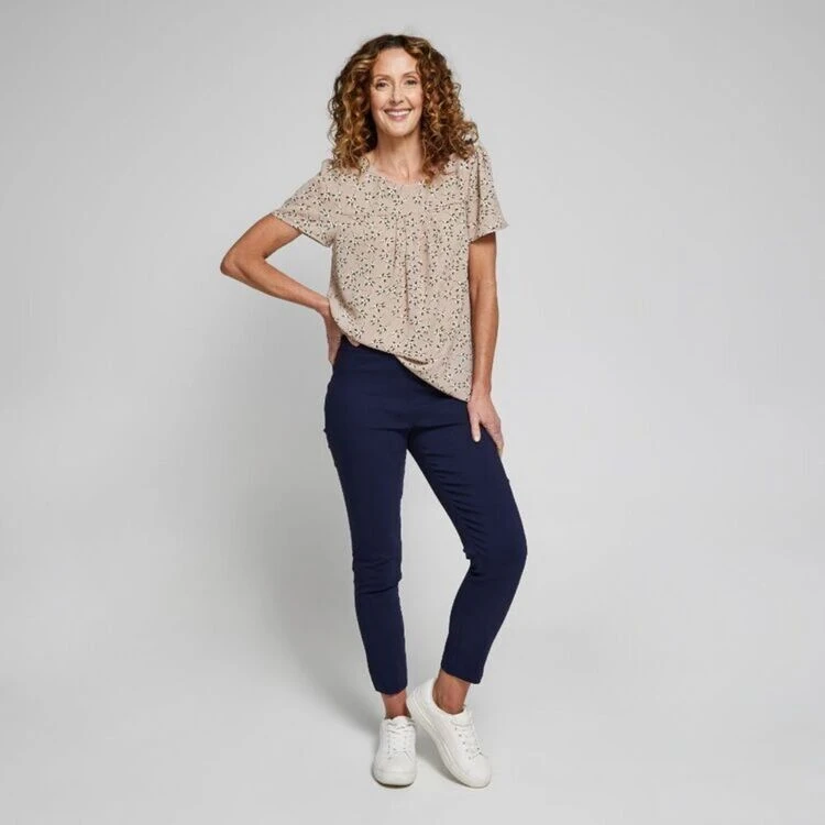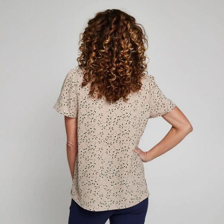 The Khoko Smart Yoke Detail Blouse Dainty Print Stone is made in a textured bubble crepe fabric with a simple and cute print all over. It features a flattering yoke on the front with pleats to give volume through to the hem and short sleeves pitched up at the side to give a sculpted sleeve shape. Pair this with some dark blue pants and white sneakers for a perky casual outfit!