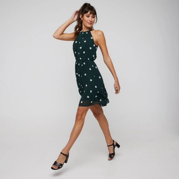 The Stella Women’s Rainforest Spot Halter Dress is your fun and chic dress for the Summer holidays. This dress features an exploded deep green and milk polka dot print in soft chiffon, an elegantly pleated halter neckline, self waist tie and tiered flirty hem. This chic essential will easily be your go-to party dress for the season.